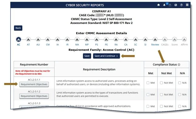 Enter Assessment Details: Enter assessment data; review Requirement Objectives to each Requirement Number by selecting the Requirement Objectives button. Select the applicable Compliance Status. Select Save and Continue to navigate through each Requirement Family.
