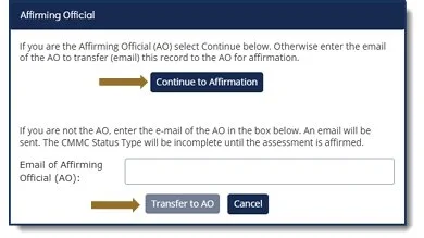 Transfer to Affirming Official (AO): If the user entering the assessment is not the AO, the assessment can be forwarded via email, to the AO by entering their email and selecting “Transfer to AO”.