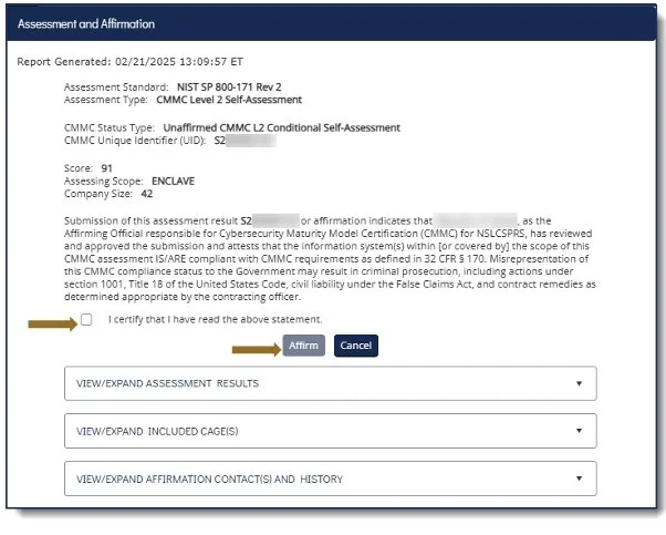 Affirm the Assessment: Review the assessment details, certify review of the affirmation statement, and select “Affirm”.