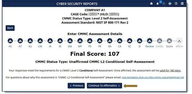Score: Only CMMC L2 Conditional (score = 88 to 109) and Final Self-Assessments (score = 110) can be affirmed.