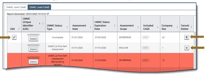 Assessment Edit/Cancel/Delete: A Cyber Vendor User may Edit, Cancel, or Delete certain CMMC Status Types. Select the available icon to complete the action.