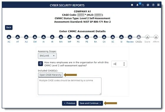 Additional Assessment Details: Add Assessing Scope, Employee Count, and Included CAGE(s) as required. Select the “Open CAGE Hierarchy” button to add CAGEs or enter comma delimited CAGEs in the data field provided. Select “Save and Continue.”