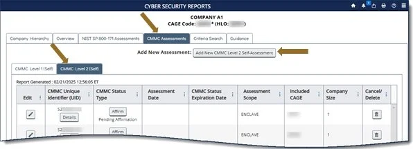 Add New CMMC Level 2 Self-Assessment: Within the CMMC Assessments and CMMC Level 2 (Self) tabs, select “Add New Level 2 CMMC Self-Assessment”.